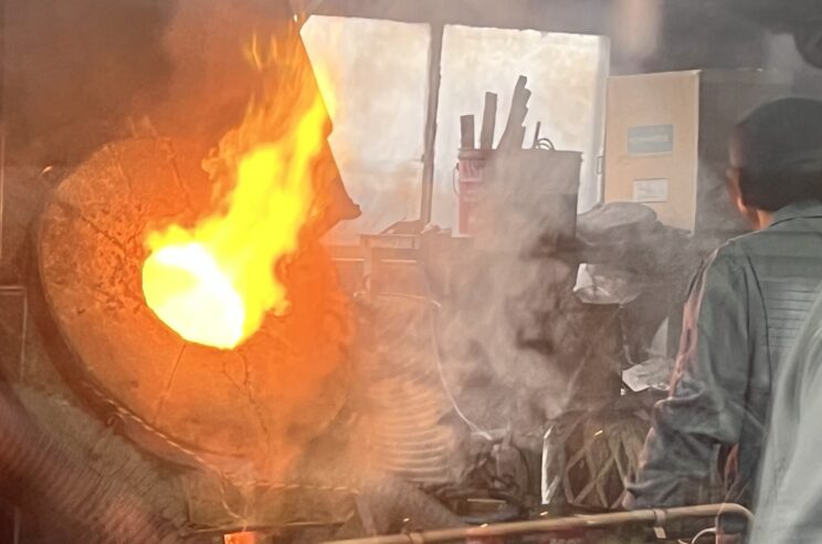 銅の融点は1080度なので、窯の温度を1150度まで上げて溶かしていきます。