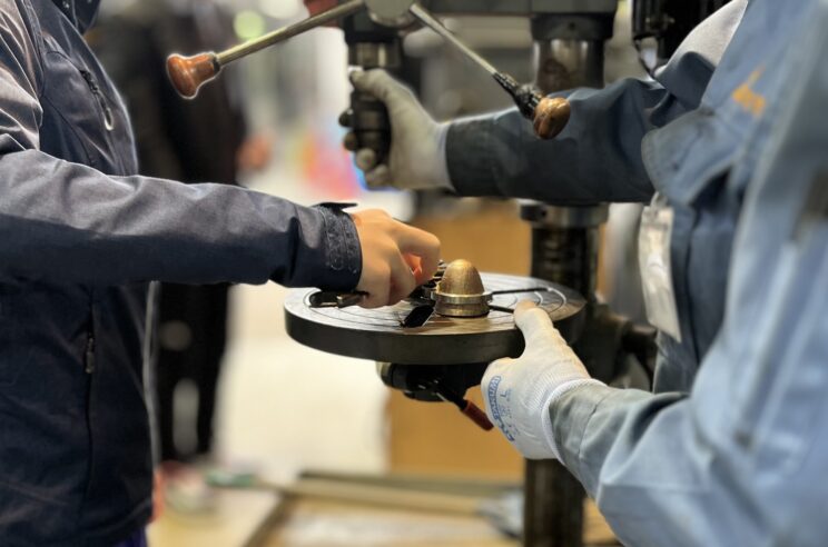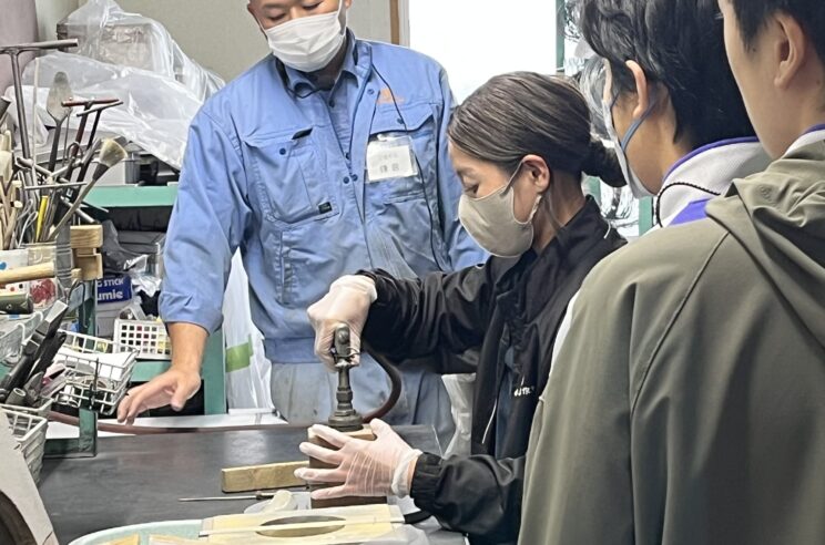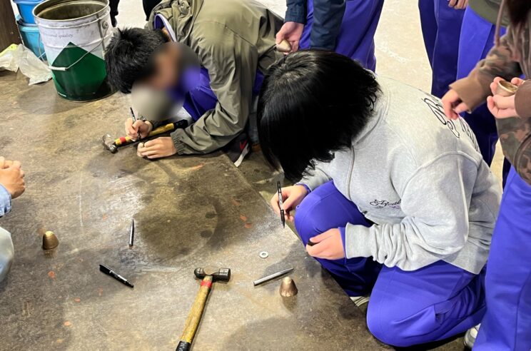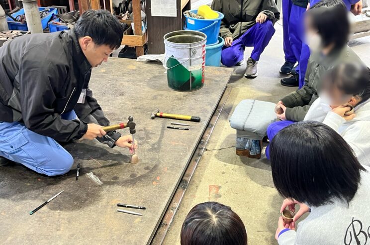 先ほど見学した鋳造工場で作られた鐘を使って風鈴を作っていきます。