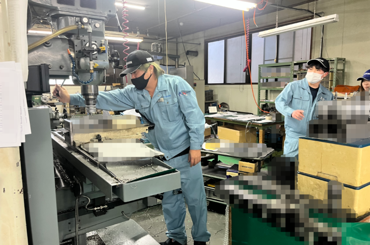 案内では、加工工程をプログラミングして自動で行うマシニングセンタについて紹介していただきました。さらに、実際に切削加工が行われている様子を目の前で見学し、生の現場の迫力を体感することができました。